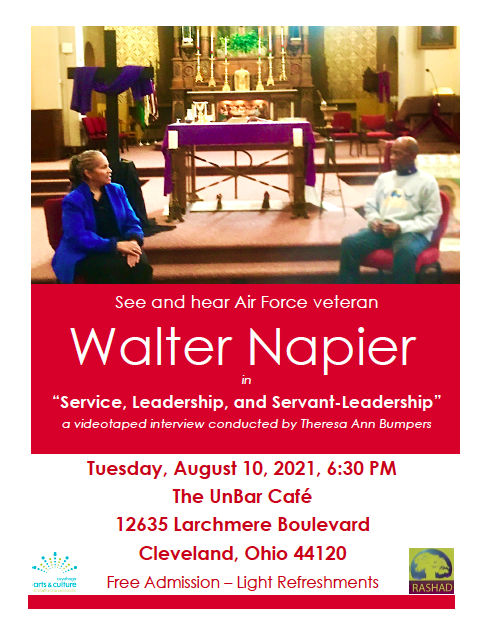 The RASHAD Center Inc. salutes Mr. Walter Napier, an alumnus of Cleveland’s Glenville High School, an Air Force veteran, and a servant-leader at St. Adalbert – Our Lady of the Blessed Sacrament Catholic Church. On Sunday, March 14, 2021, board member Theresa Ann Bumpers served as an interviewer-oral historian, capturing the story of Napier’s civilian life and military service for C-L-E/Arts and Culture TV, RASHAD’s Internet-based educational program series. In direct keeping with our arts and culture focus for 2021, after the interview, Bumpers also served as the pianist-vocalist for the church service!